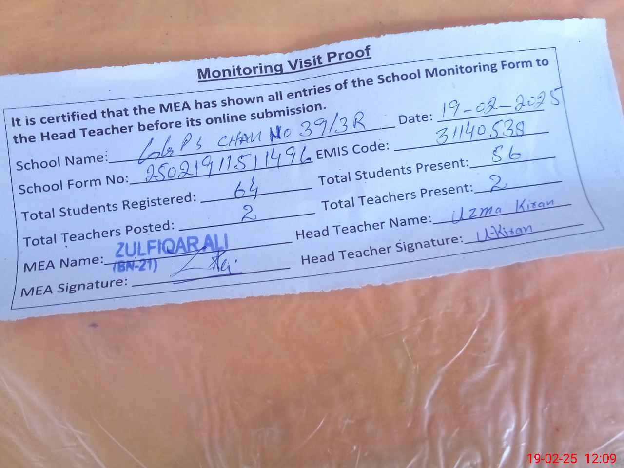 | Attendance Register | Head Teacher | MEA with School | Visit Proof |
