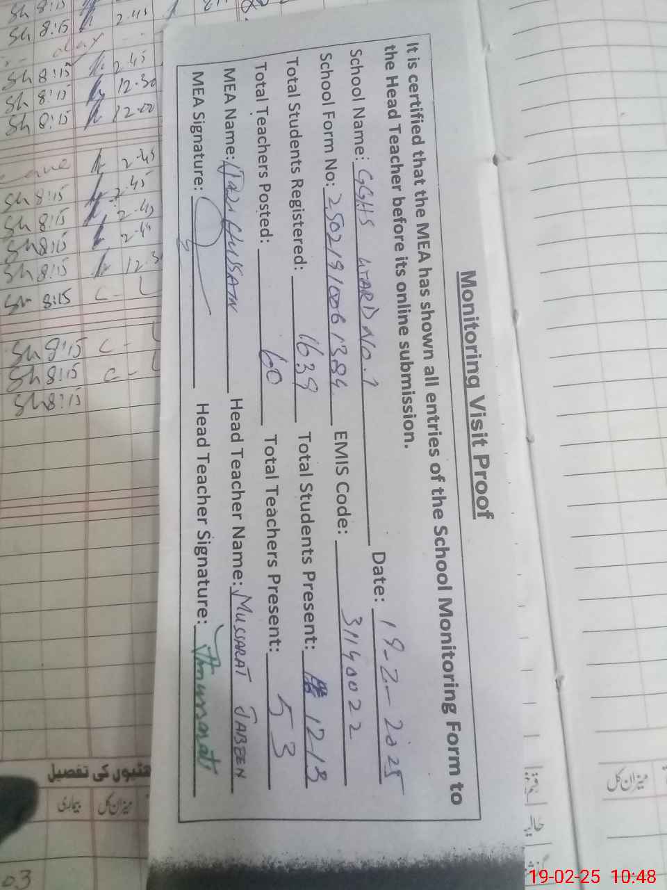 | Attendance Register | Head Teacher | MEA with School | Visit Proof |