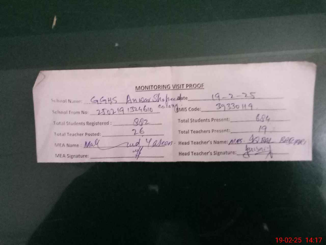 | EMIS Code: 39330119 | Name of School: GGHS ANWAR SHAHEED COLONY | |||