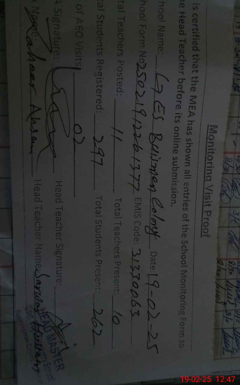 | Certified that this School was Inspected by the Undersigned MEA/DMO Today and the Information Stated Above is as Per Record. | |||||