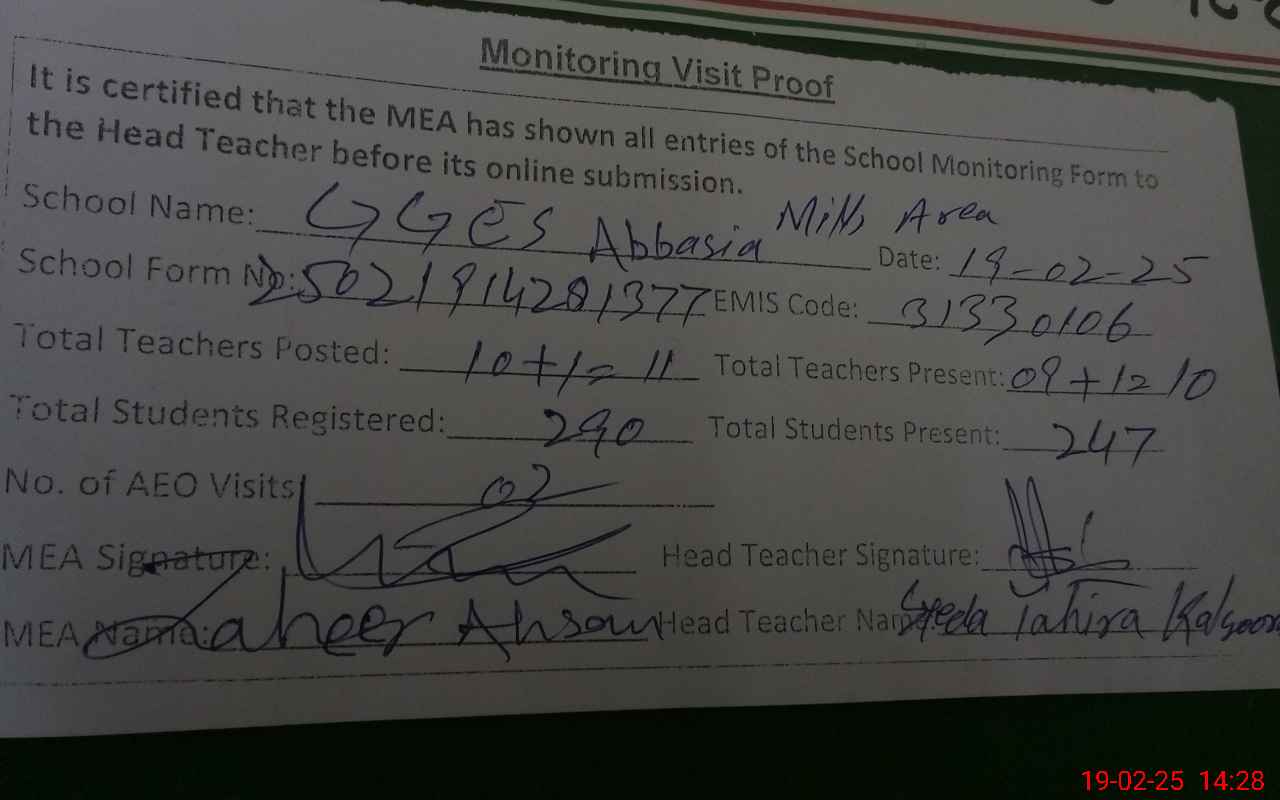 | Certified that this School was Inspected by the Undersigned MEA/DMO Today and the Information Stated Above is as Per Record. | |||||