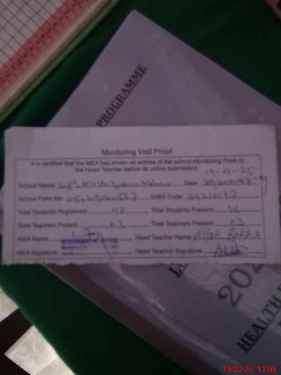 | Attendance Register | Head Teacher | MEA with School | Visit Proof |