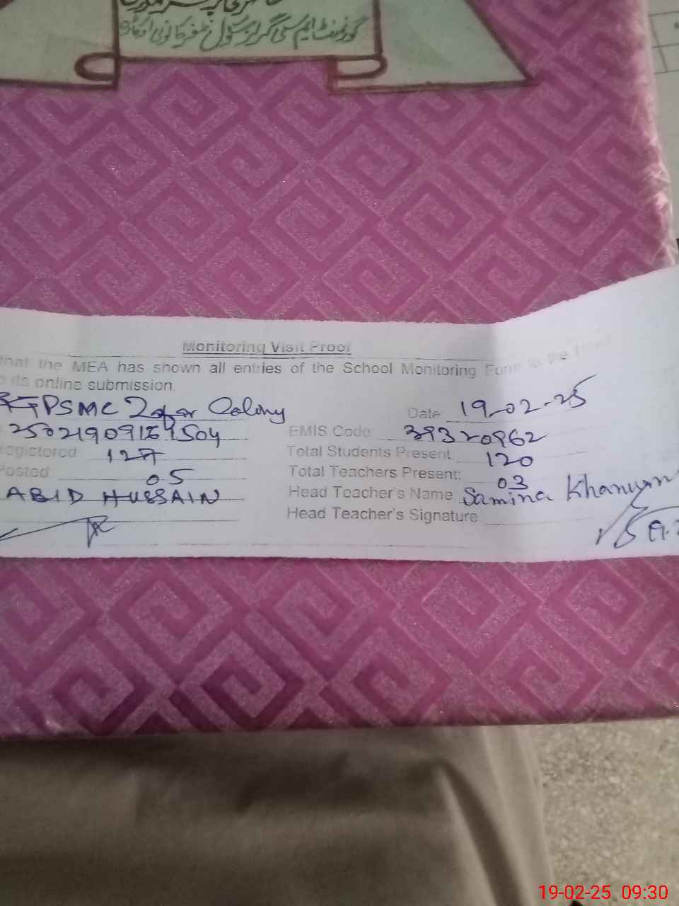 | EMIS Code: 39320962 | Name of School: GGPS MC ZAFAR COLONY | |||