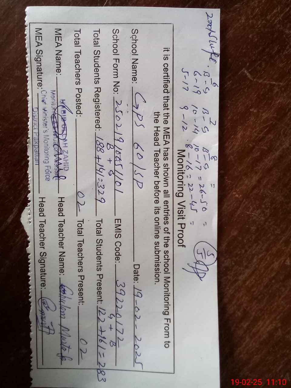 | Attendance Register | Head Teacher | MEA with School | Visit Proof |