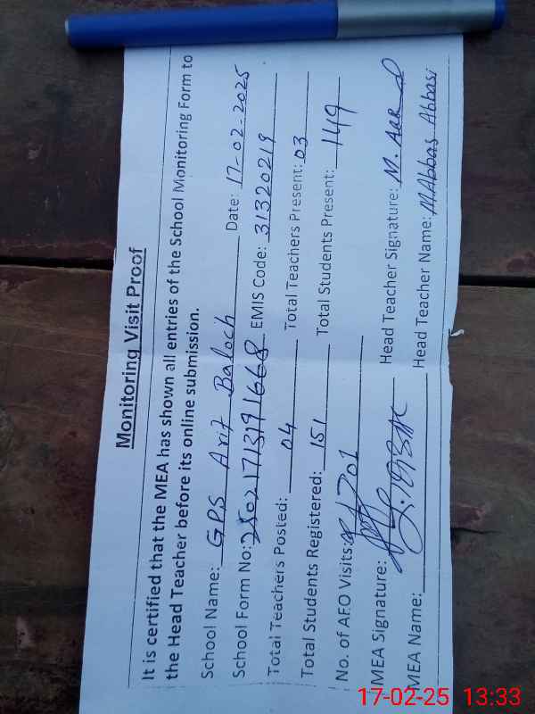 | EMIS Code: 31320219 | Name of School: GPS AARIF BLOCH | |||