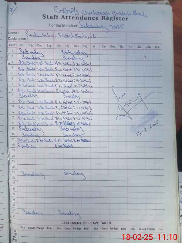 | CNIC | Full Name | Designation | R/C | Absence During Last Calender Month |