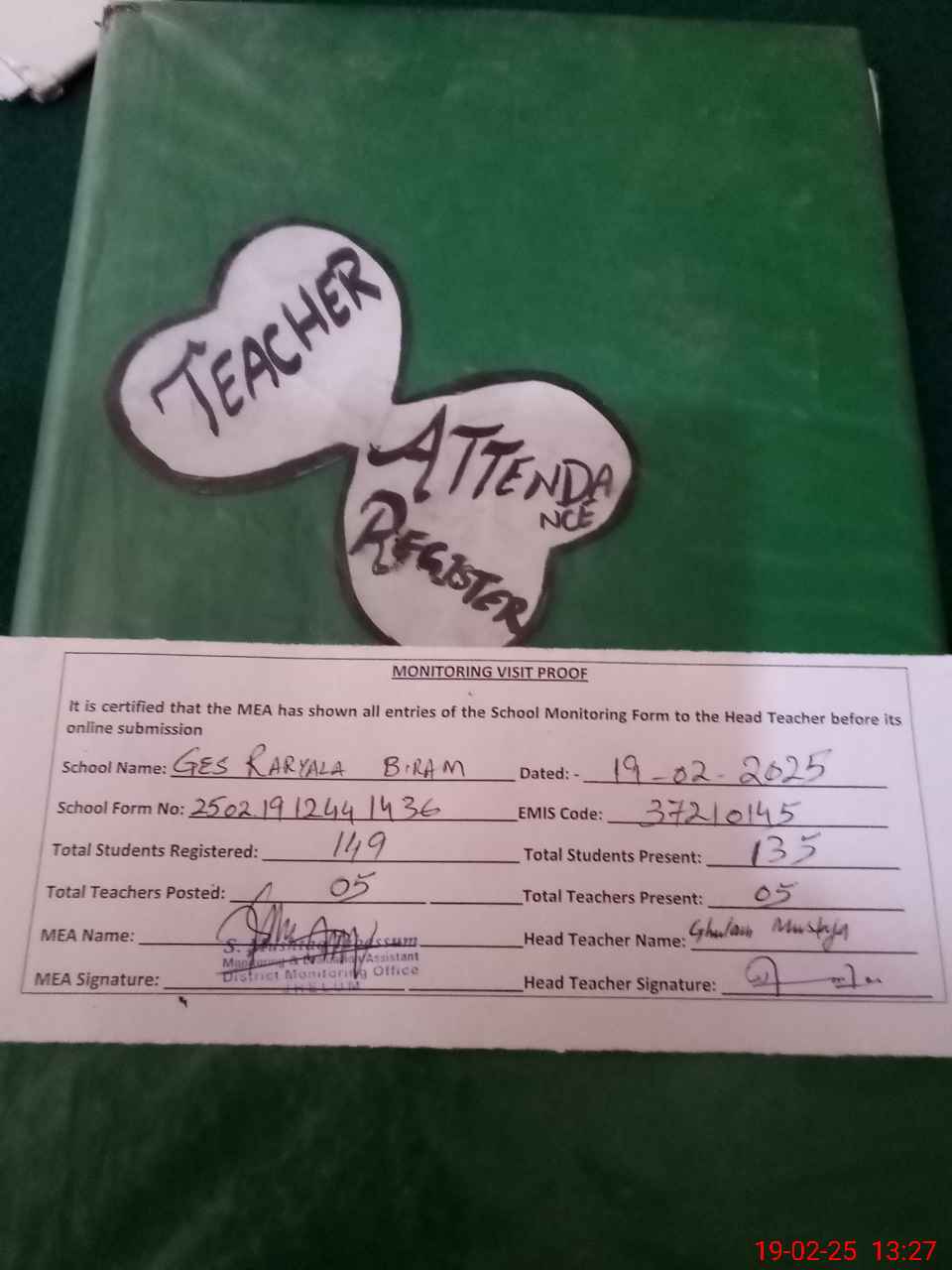 | Attendance Register | Head Teacher | MEA with School | Visit Proof |