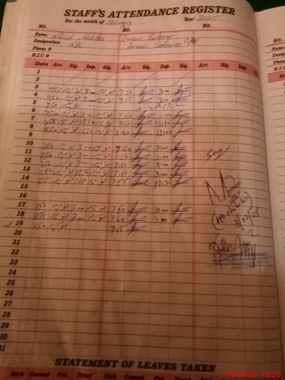 | CNIC | Full Name | Designation | R/C | Absence During Last Calender Month |