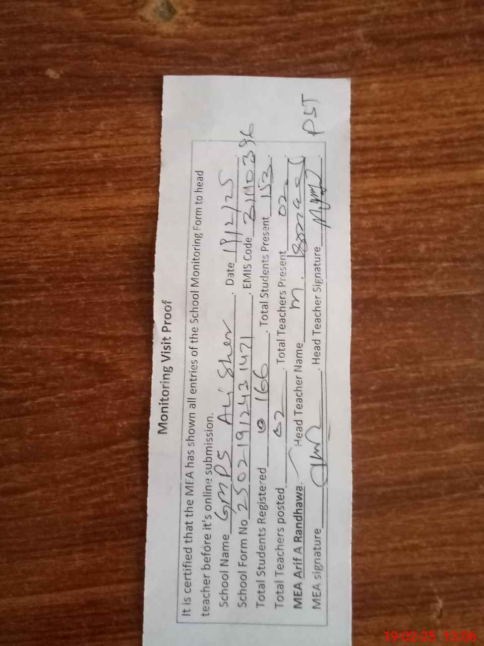 | Attendance Register | Head Teacher | MEA with School | Visit Proof |