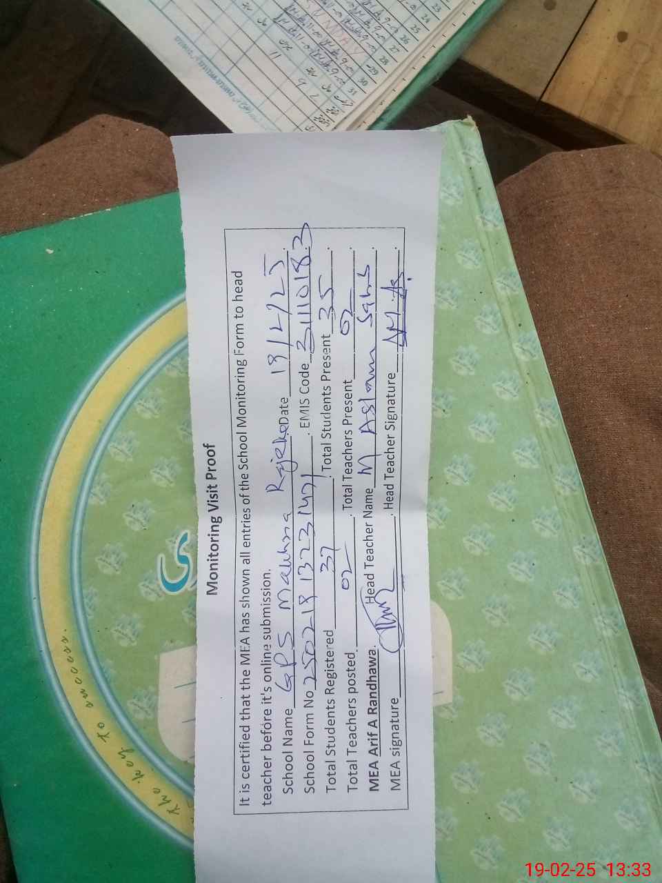 | Attendance Register | Head Teacher | MEA with School | Visit Proof |