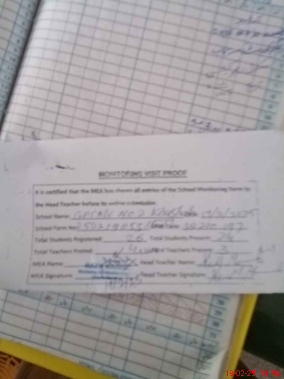 | Attendance Register | Head Teacher | MEA with School | Visit Proof |