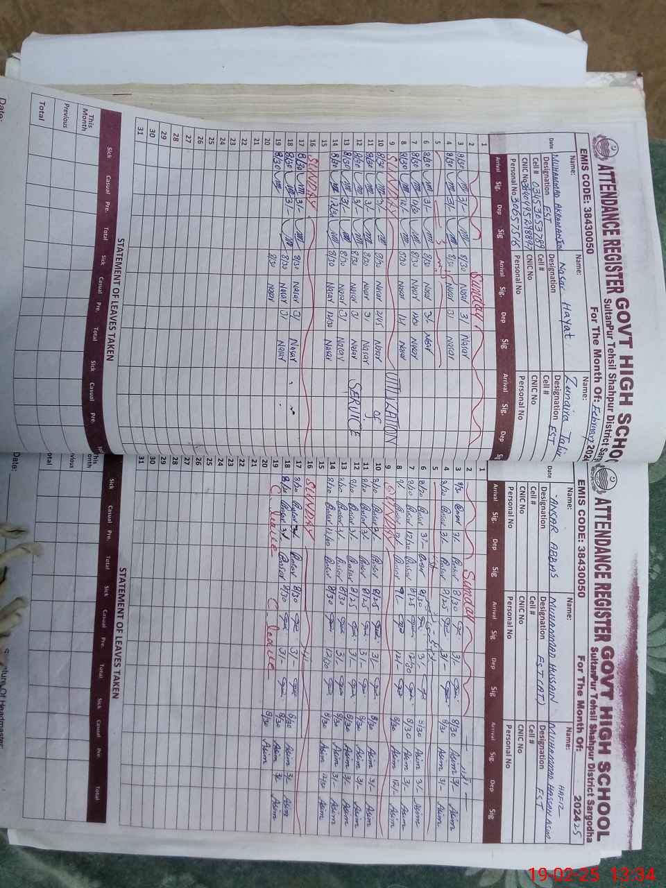 | CNIC | Full Name | Designation | R/C | Absence During Last Calender Month |