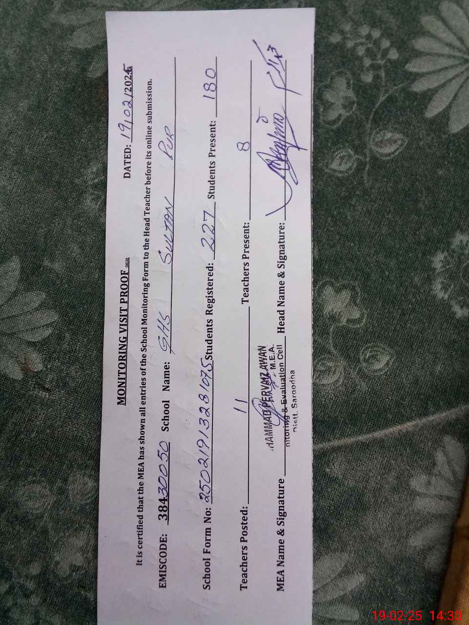 | Certified that this School was Inspected by the Undersigned MEA/DMO Today and the Information Stated Above is as Per Record. | |||||