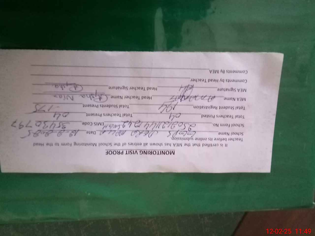 | Attendance Register | Head Teacher | MEA with School | Visit Proof |