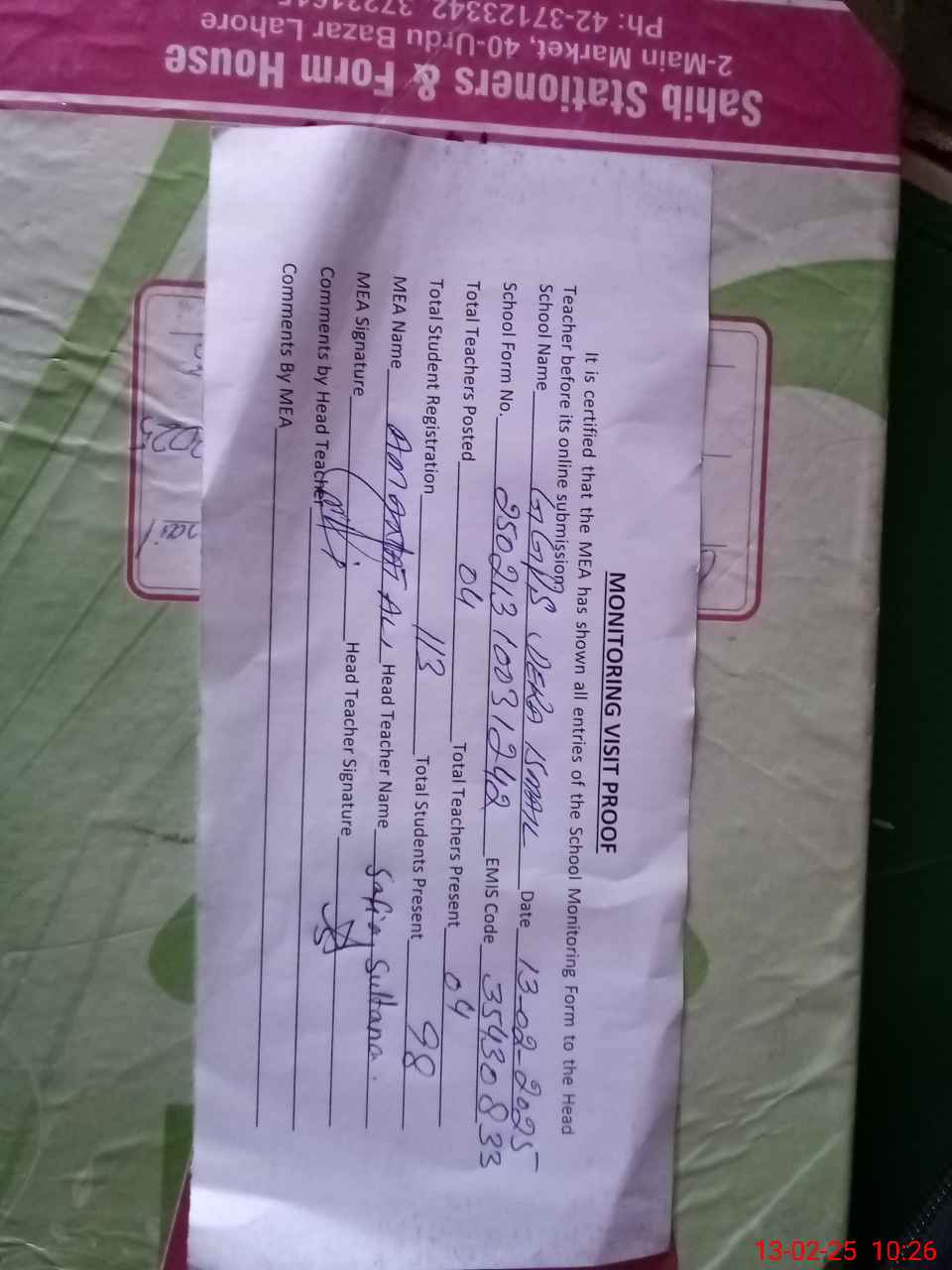 | Attendance Register | Head Teacher | MEA with School | Visit Proof |