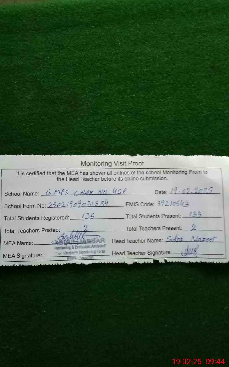 | EMIS Code: 39210543 | Name of School: GMPS CHAK NO. 4/SP | |||