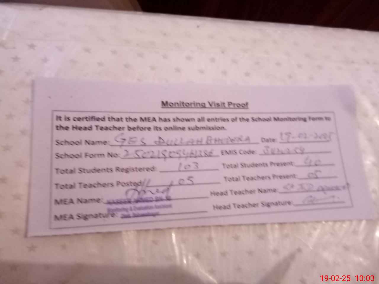 | Certified that this School was Inspected by the Undersigned MEA/DMO Today and the Information Stated Above is as Per Record. | |||||