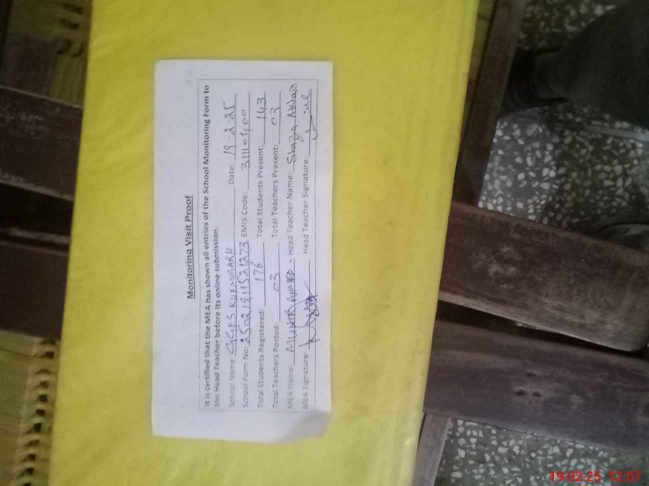 | Attendance Register | Head Teacher | MEA with School | Visit Proof |