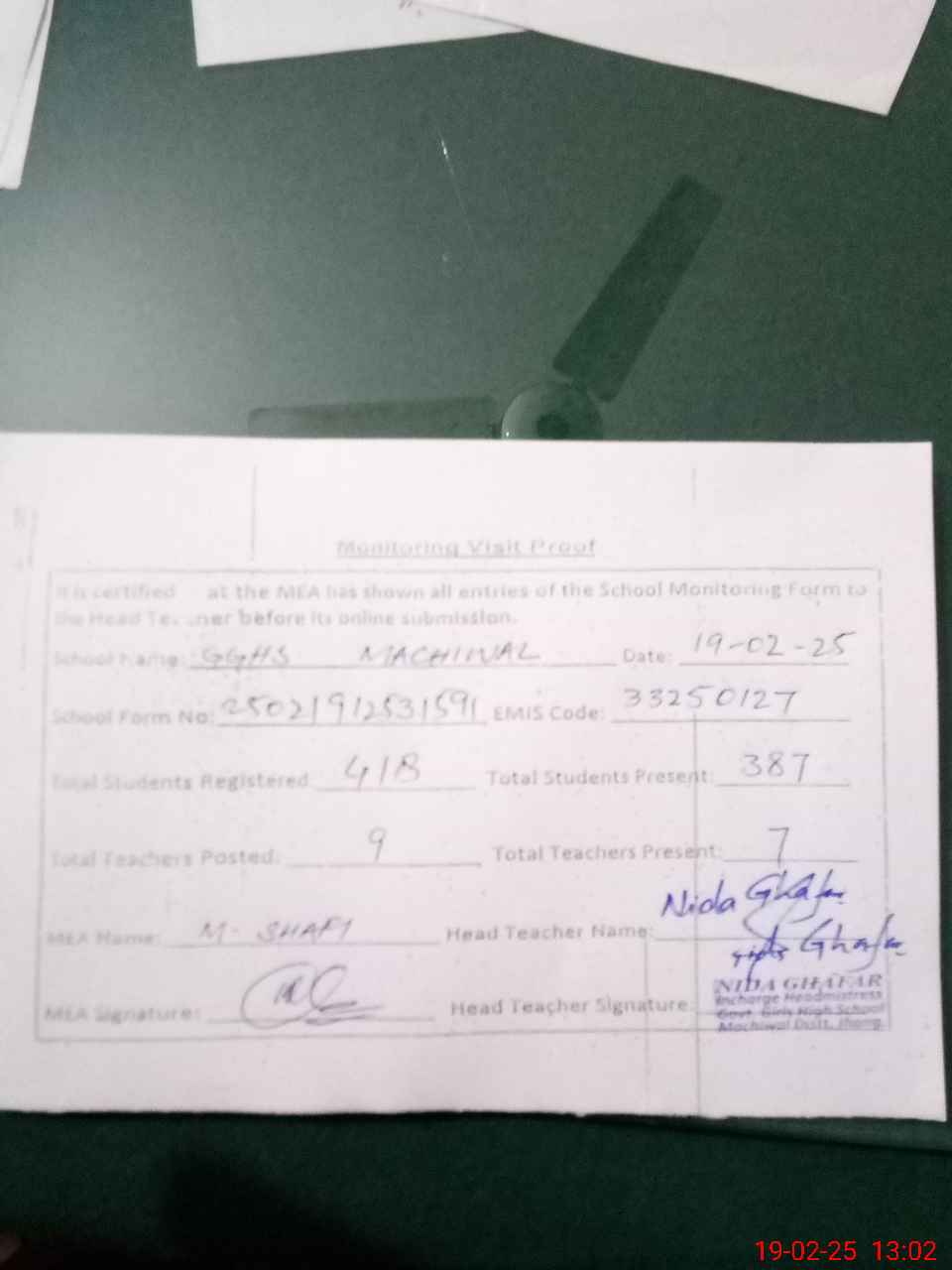 | Certified that this School was Inspected by the Undersigned MEA/DMO Today and the Information Stated Above is as Per Record. | |||||