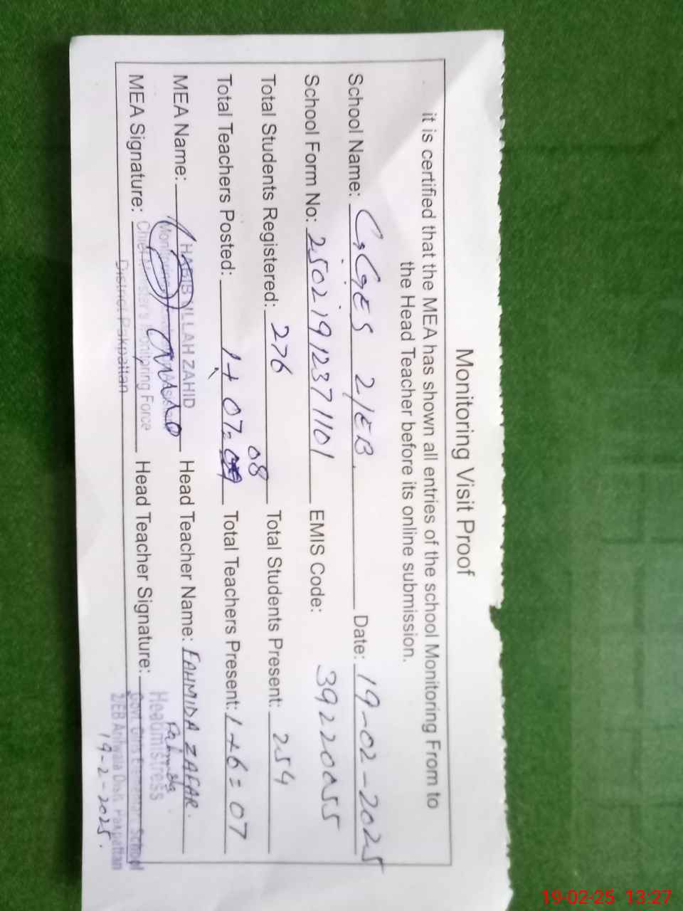 | Attendance Register | Head Teacher | MEA with School | Visit Proof |