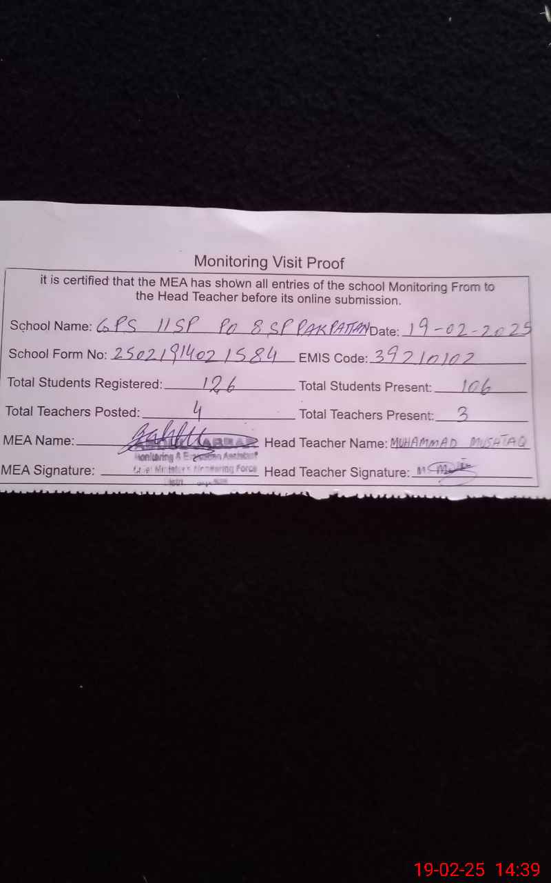 | EMIS Code: 39210102 | Name of School: GPS 11/SP P.O 8/S.P PAKPATTAN | |||