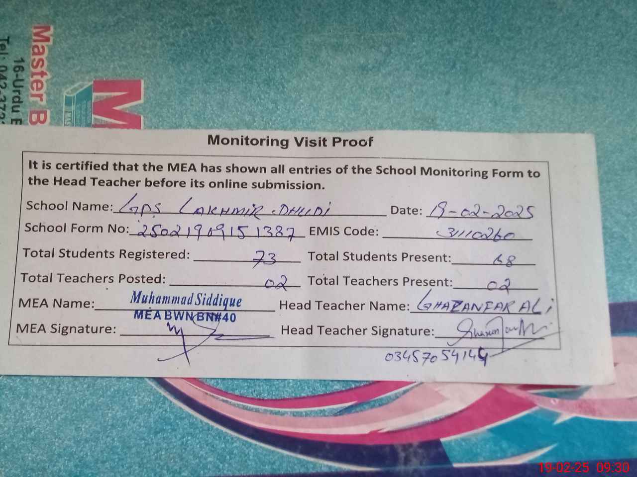 | Attendance Register | Head Teacher | MEA with School | Visit Proof |
