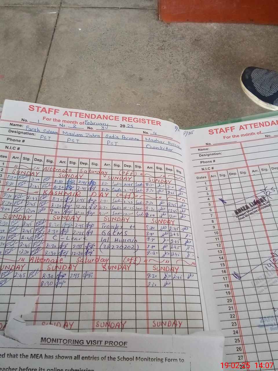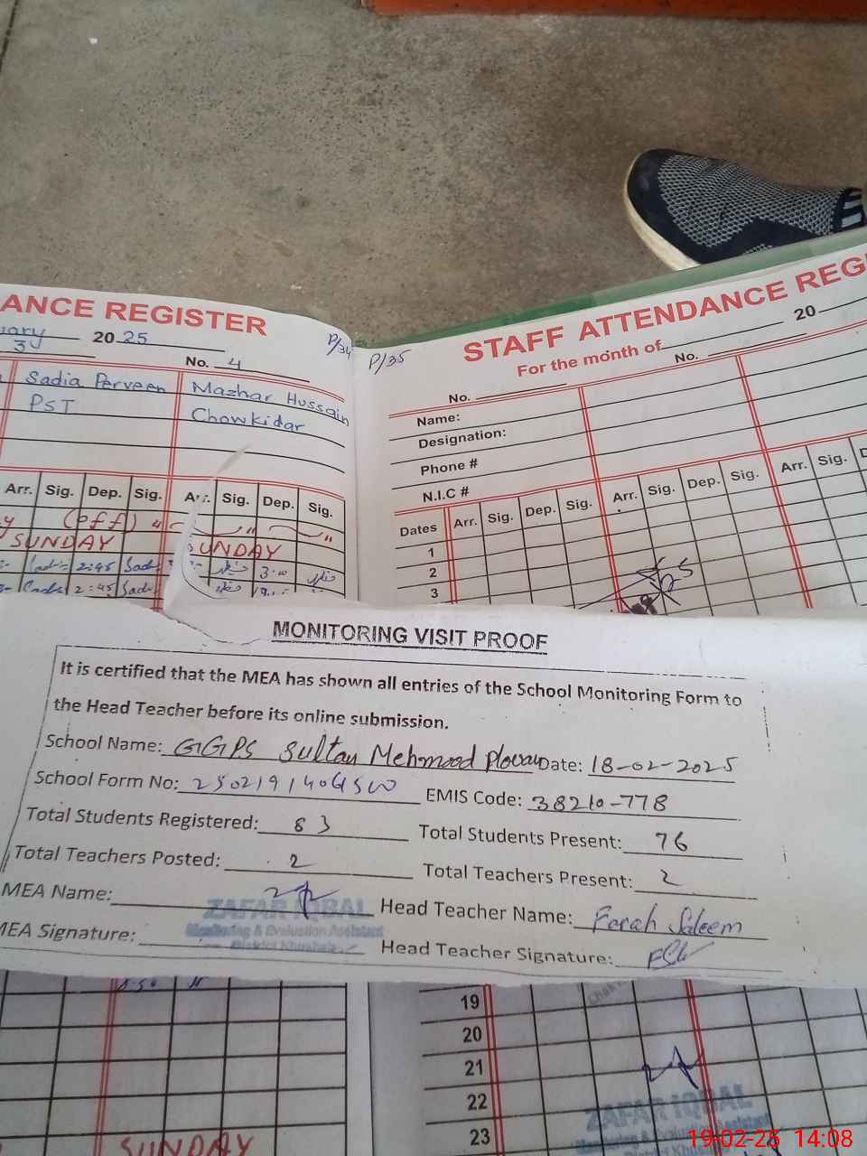 | Attendance Register | Head Teacher | MEA with School | Visit Proof |