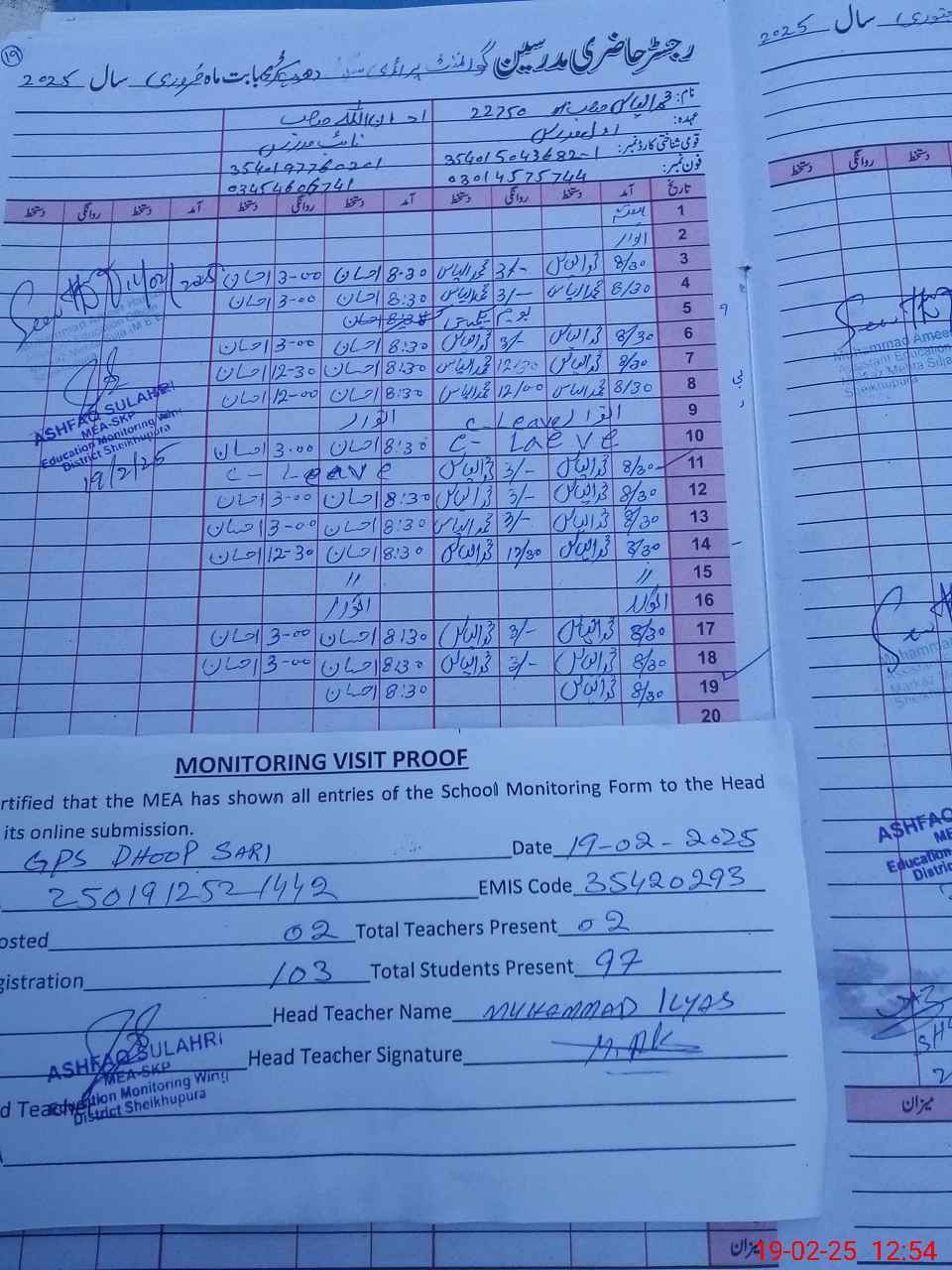 | Attendance Register | Head Teacher | MEA with School | Visit Proof |