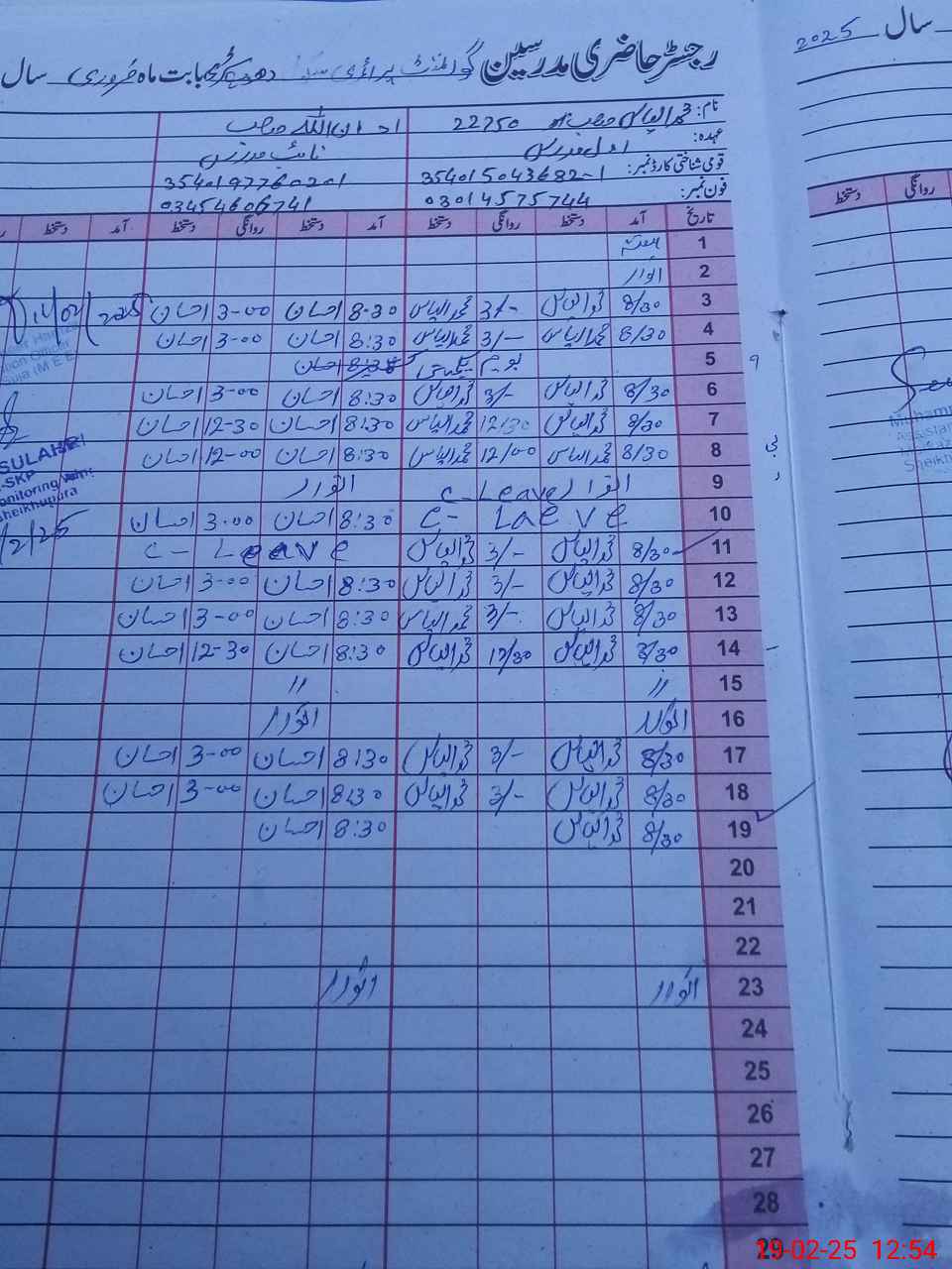 | CNIC | Full Name | Designation | R/C | Absence During Last Calender Month |