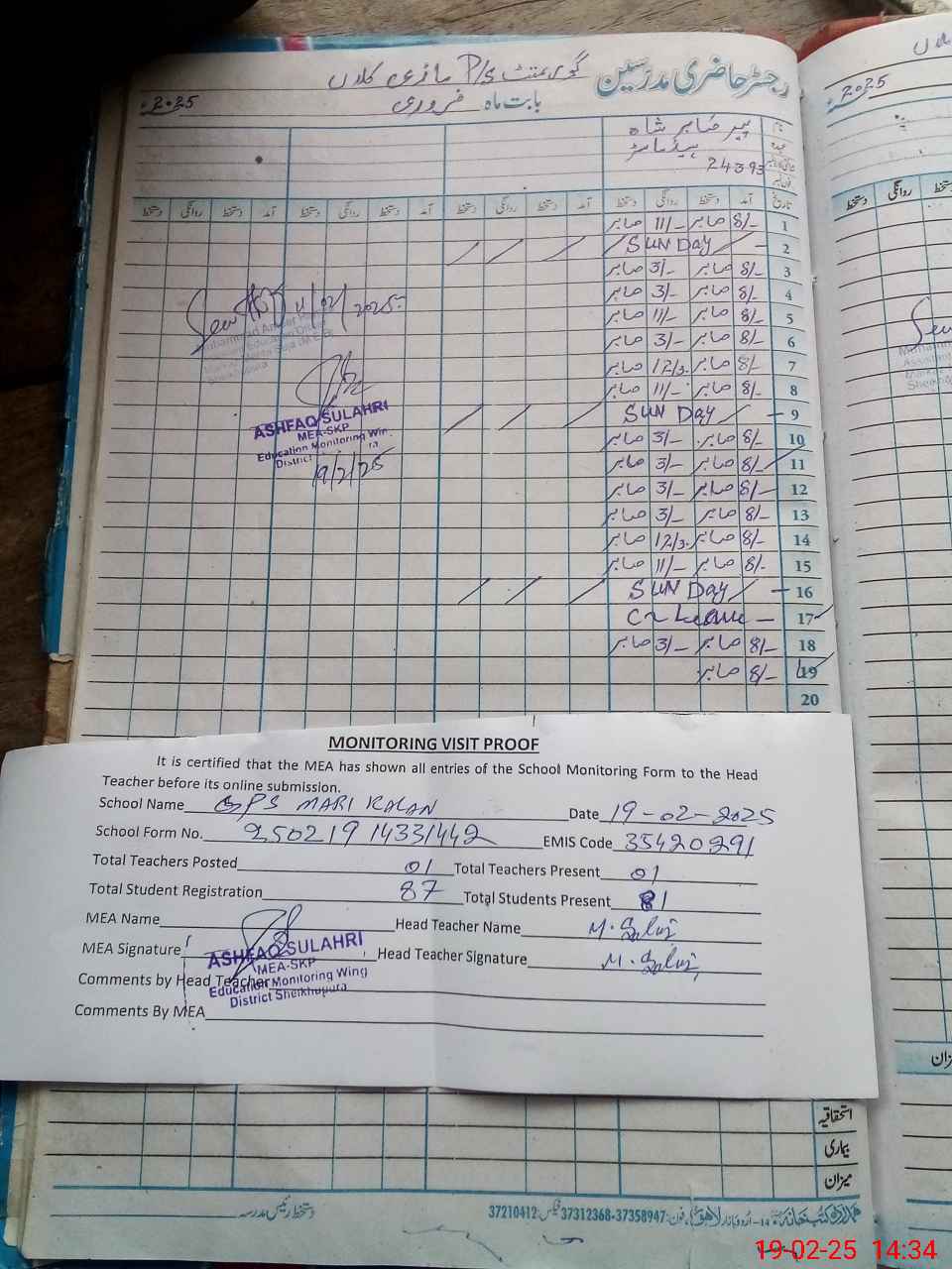 | Attendance Register | Head Teacher | MEA with School | Visit Proof |
