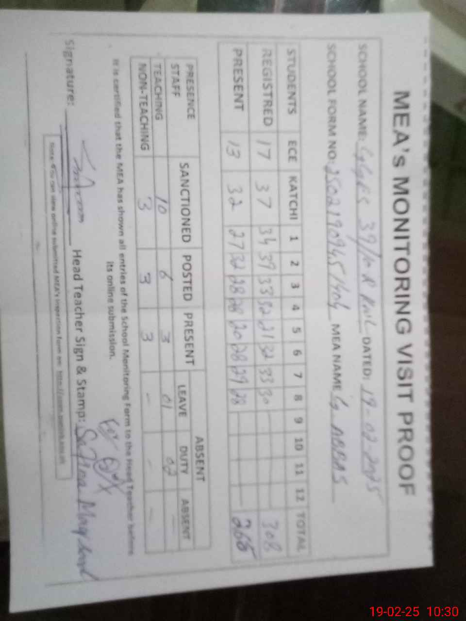| Attendance Register | Head Teacher | MEA with School | Visit Proof |