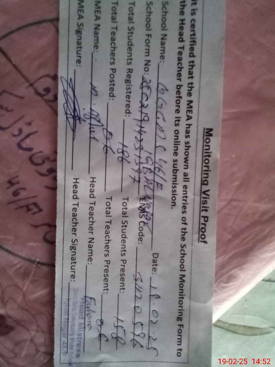 | Certified that this School was Inspected by the Undersigned MEA/DMO Today and the Information Stated Above is as Per Record. | |||||