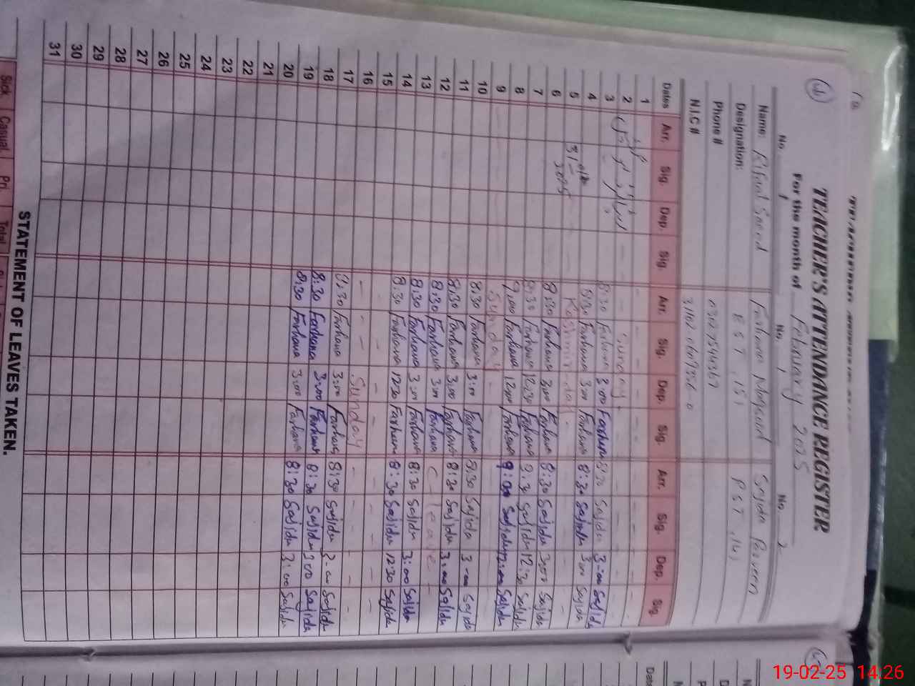| CNIC | Full Name | Designation | R/C | Absence During Last Calender Month |