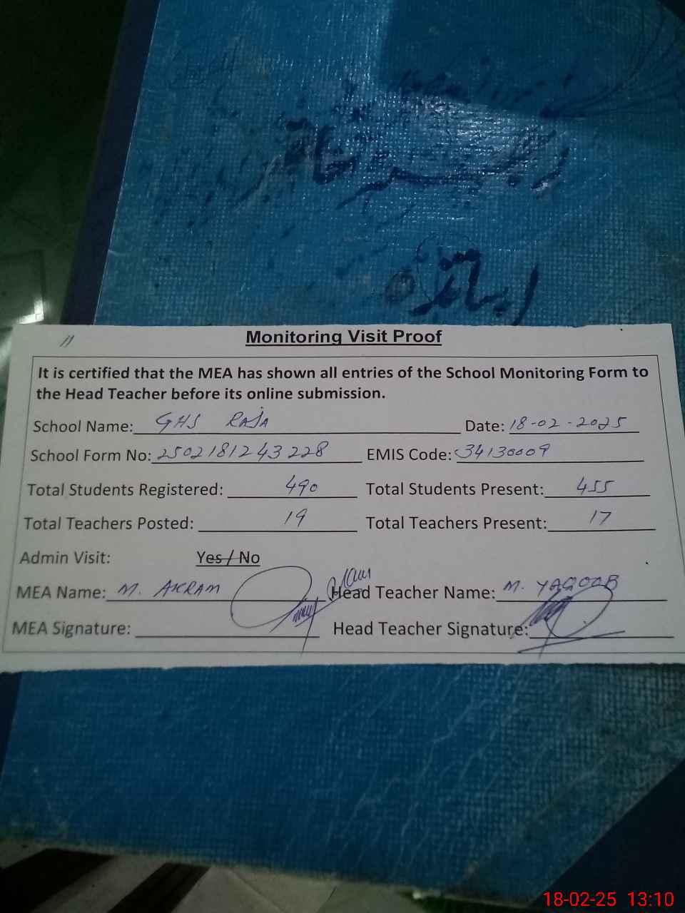 | Attendance Register | Head Teacher | MEA with School | Visit Proof |