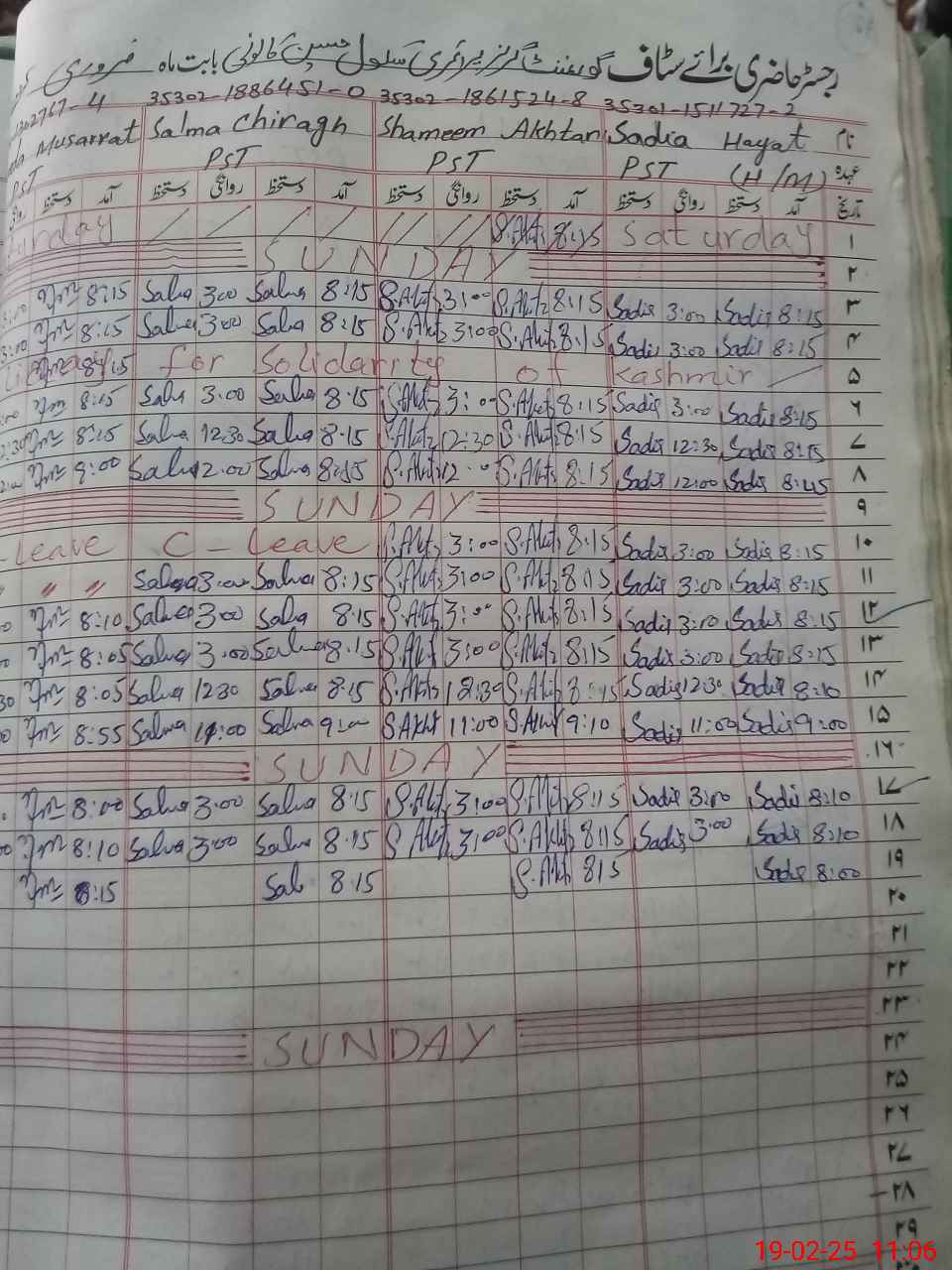 | CNIC | Full Name | Designation | R/C | Absence During Last Calender Month |