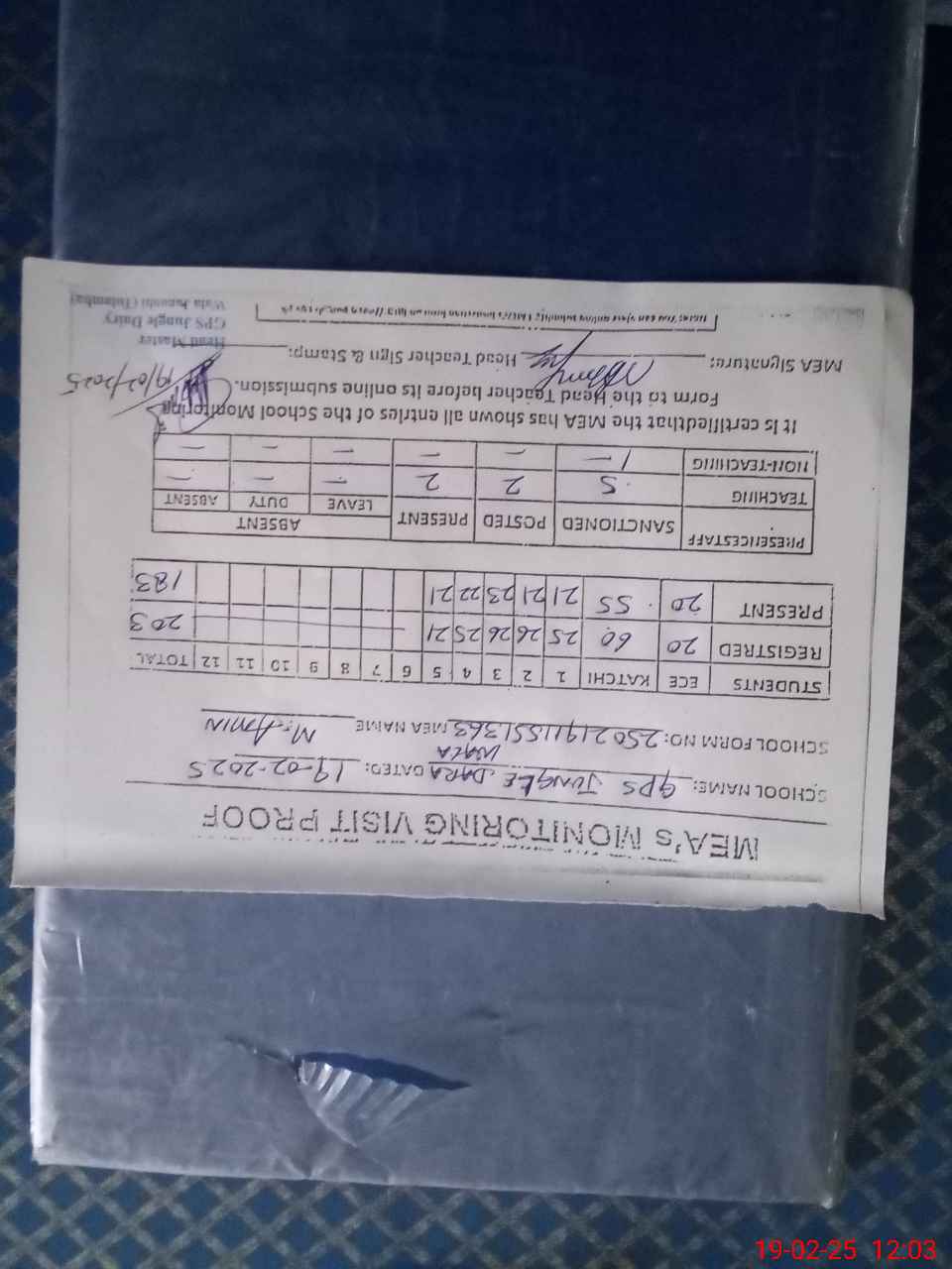| Attendance Register | Head Teacher | MEA with School | Visit Proof |