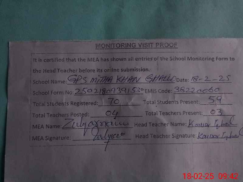| EMIS Code: 38220060 | Name of School: GPS MITHA KHAN GHALL | |||
