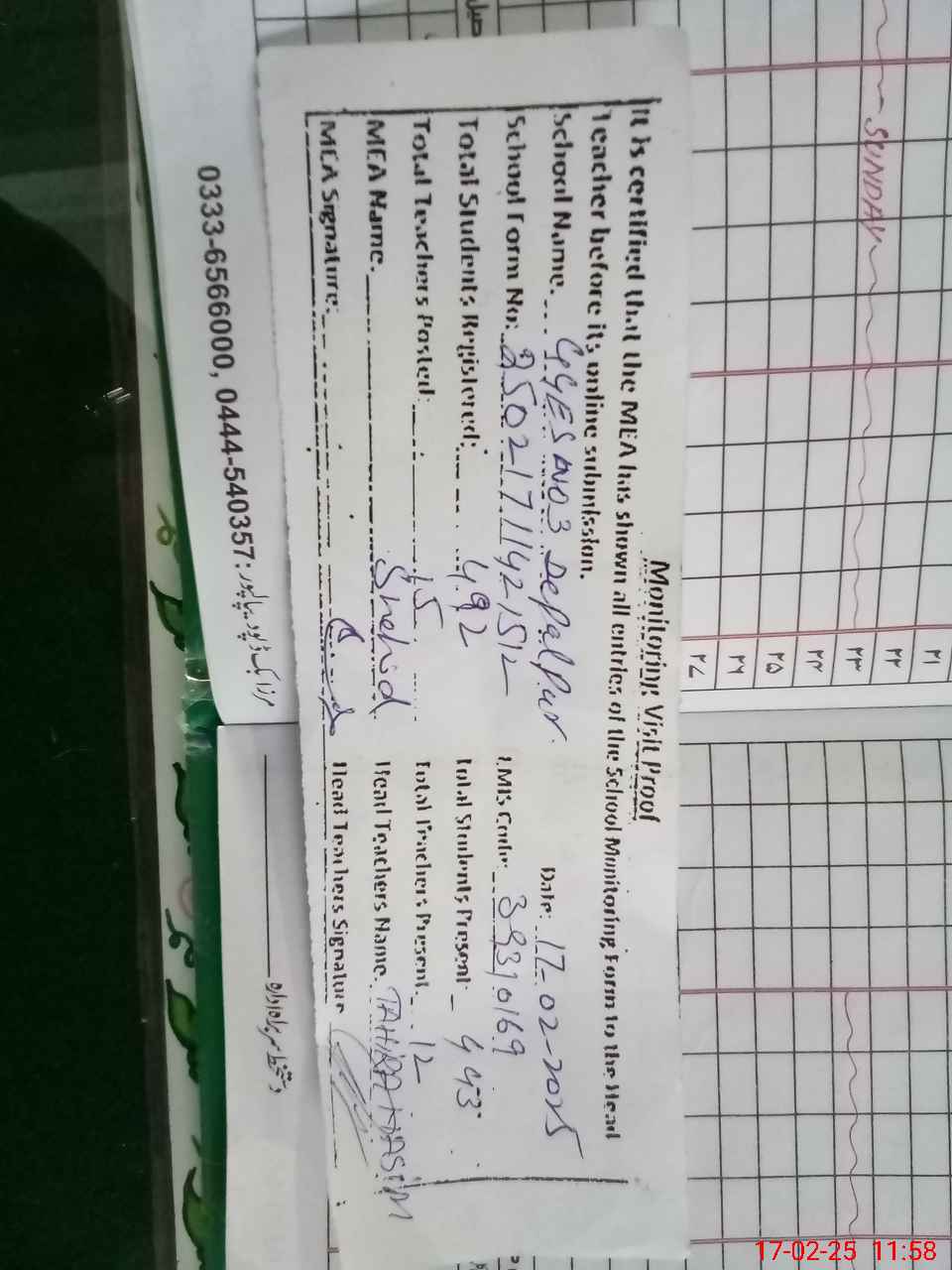 | Attendance Register | Head Teacher | MEA with School | Visit Proof |