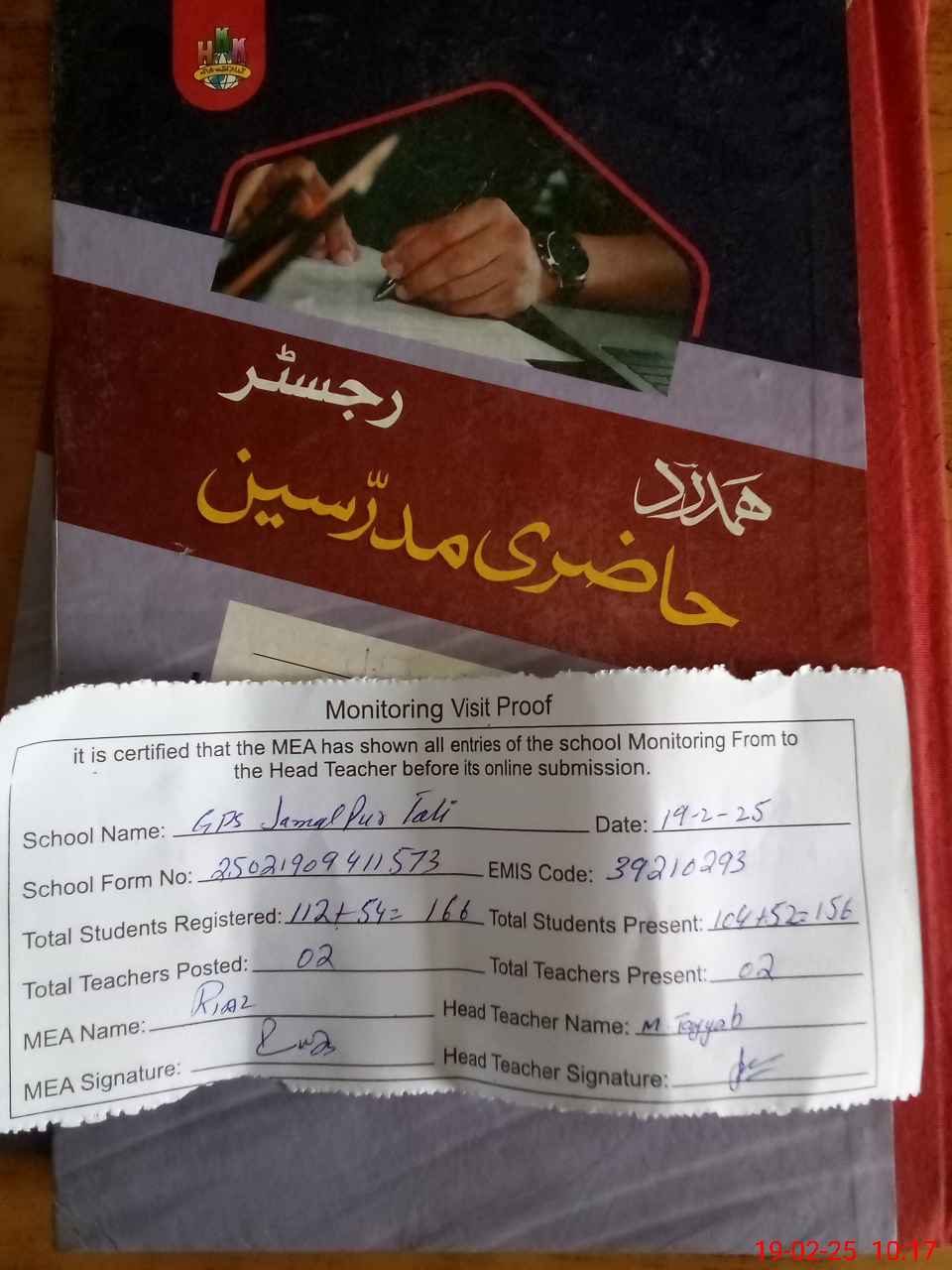 | Attendance Register | Head Teacher | MEA with School | Visit Proof |