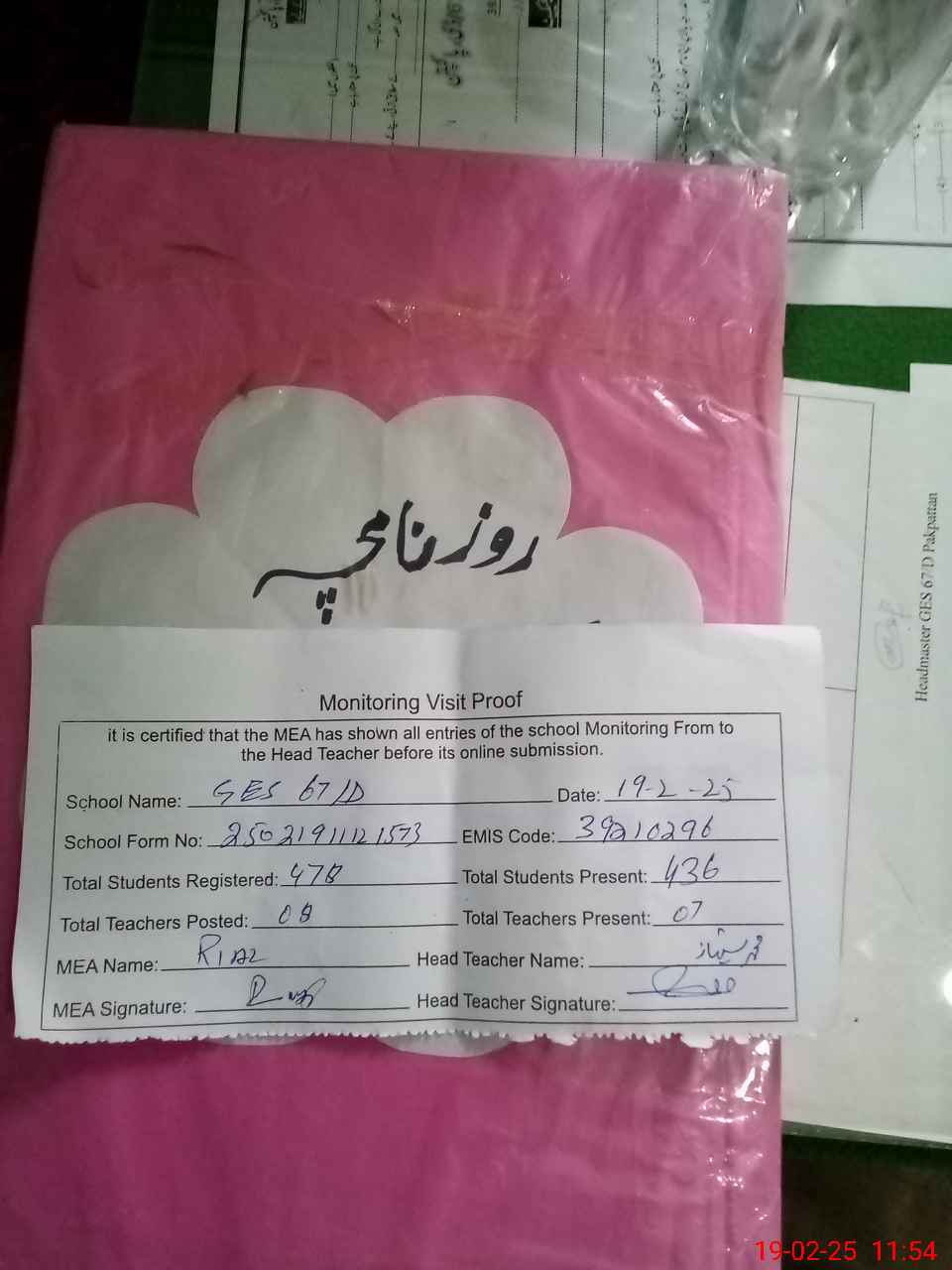 | Attendance Register | Head Teacher | MEA with School | Visit Proof |