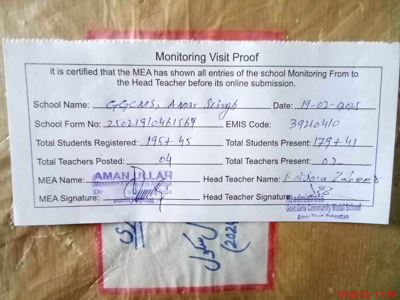 | Certified that this School was Inspected by the Undersigned MEA/DMO Today and the Information Stated Above is as Per Record. | |||||