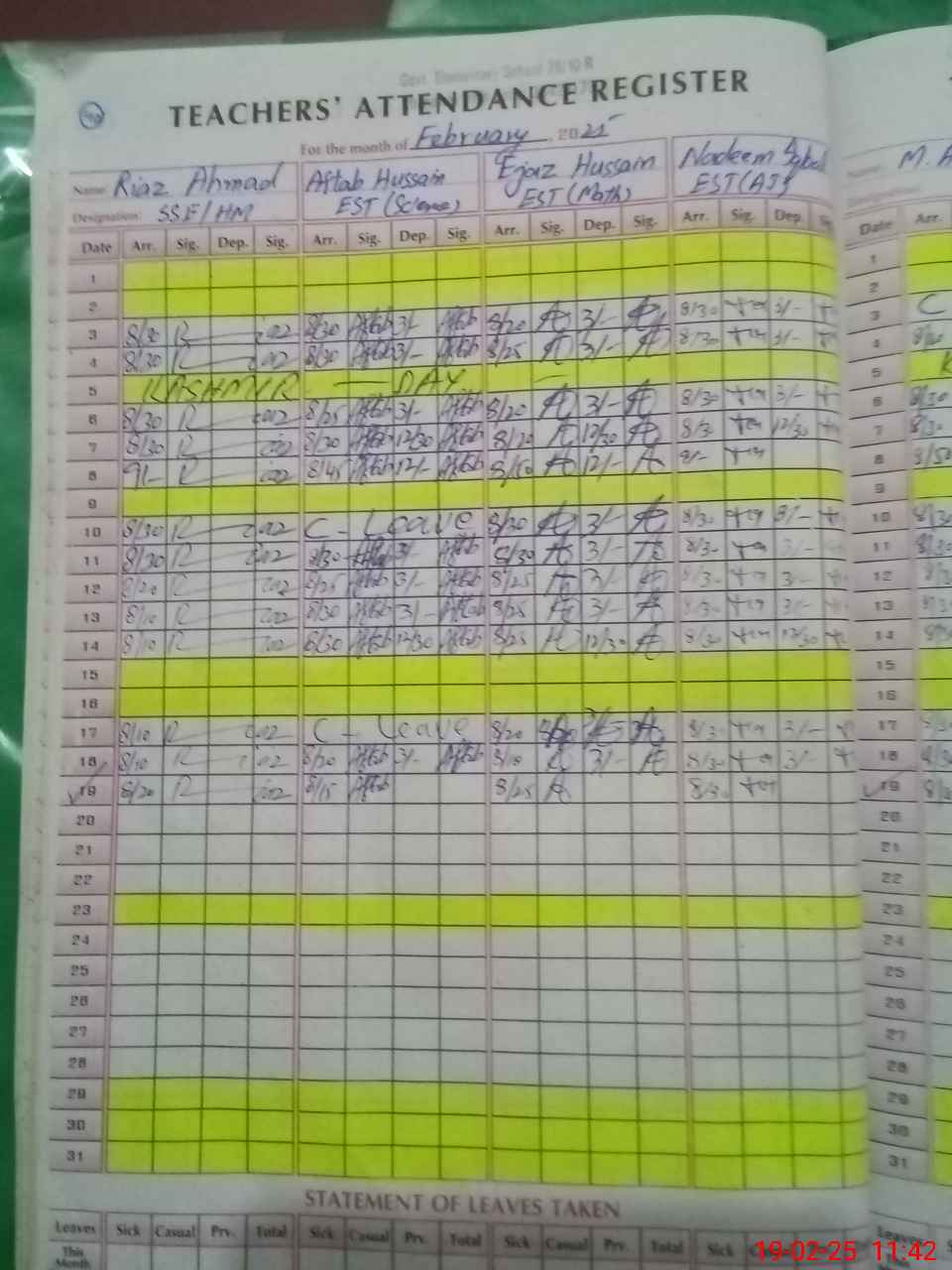 | CNIC | Full Name | Designation | R/C | Absence During Last Calender Month |