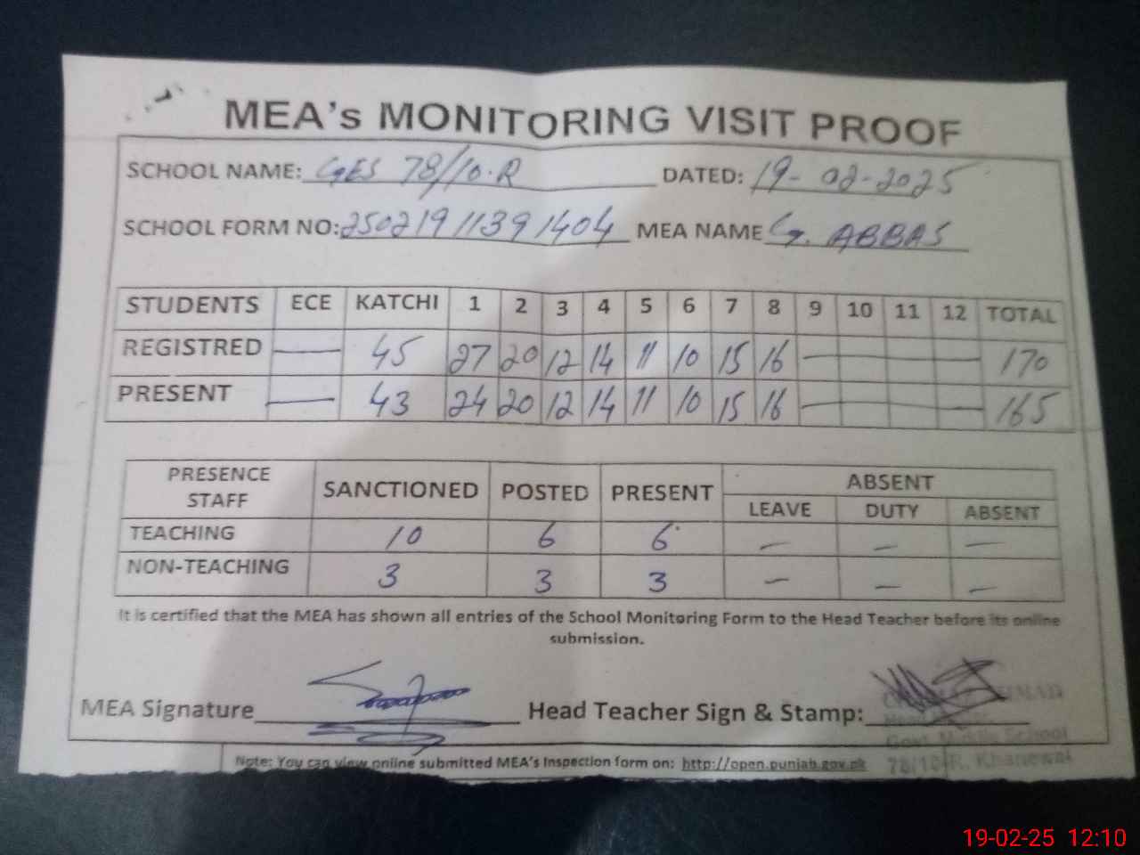 | Attendance Register | Head Teacher | MEA with School | Visit Proof |