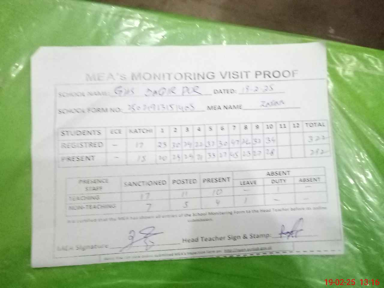| Attendance Register | Head Teacher | MEA with School | Visit Proof |