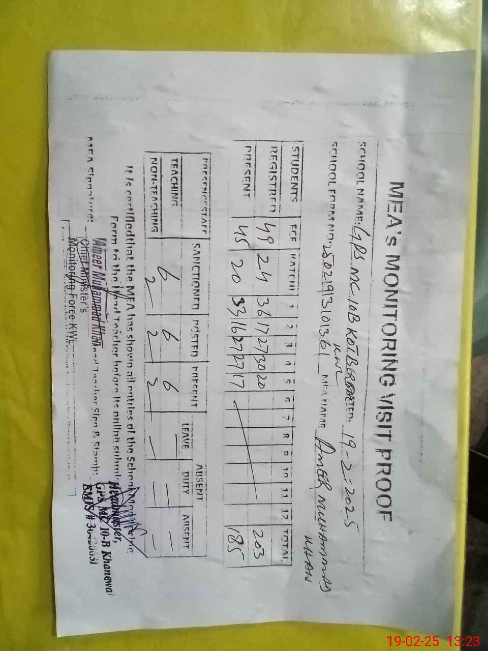 | Attendance Register | Head Teacher | MEA with School | Visit Proof |