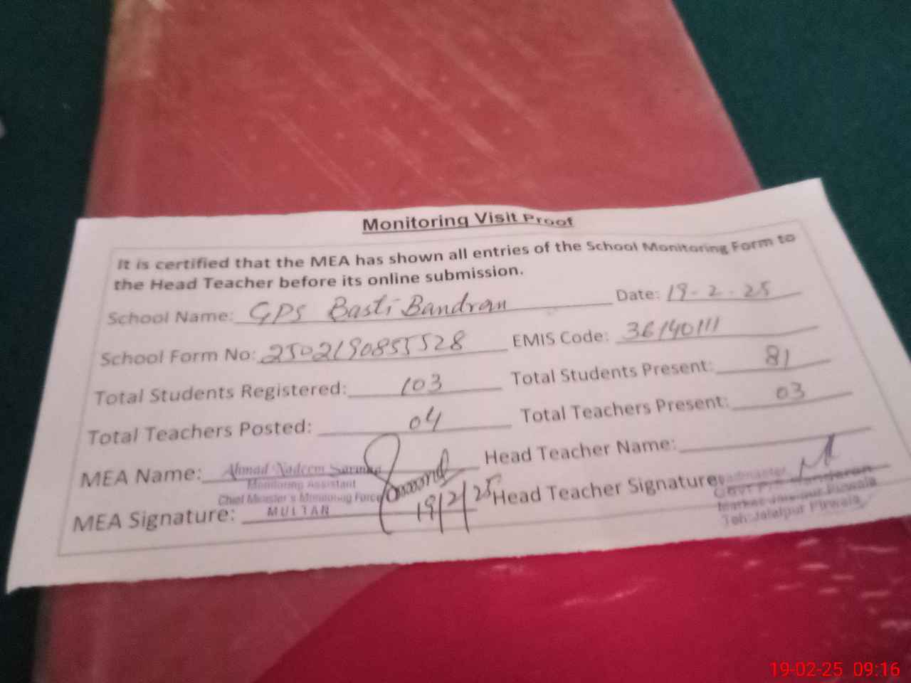 | Attendance Register | Head Teacher | MEA with School | Visit Proof |