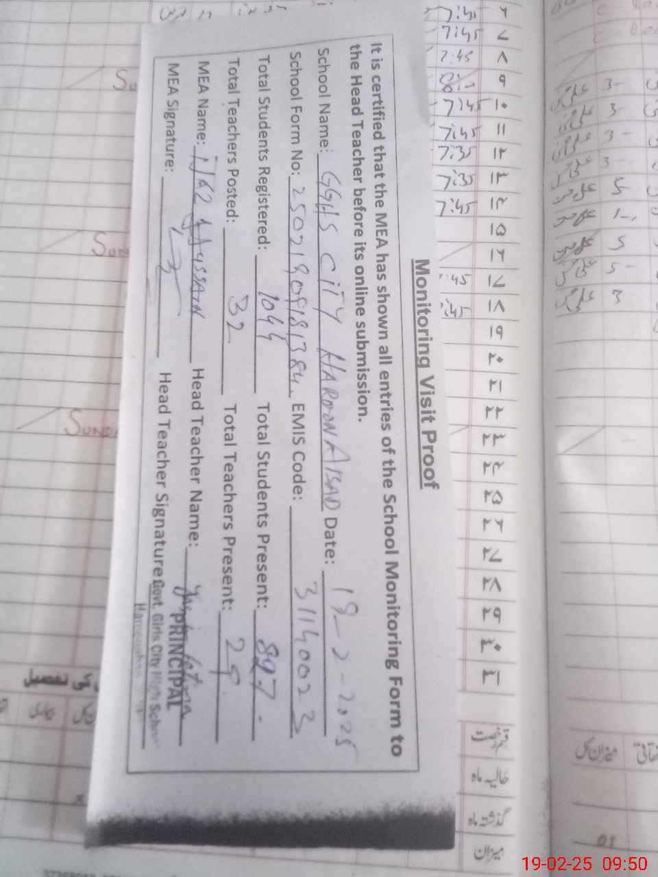 | Attendance Register | Head Teacher | MEA with School | Visit Proof |