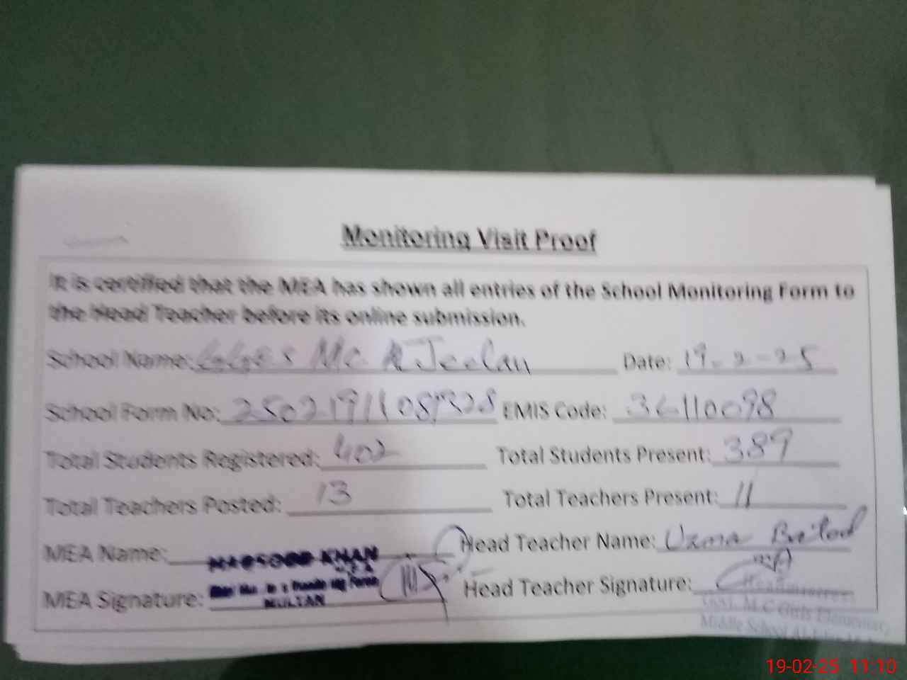 | Certified that this School was Inspected by the Undersigned MEA/DMO Today and the Information Stated Above is as Per Record. | |||||