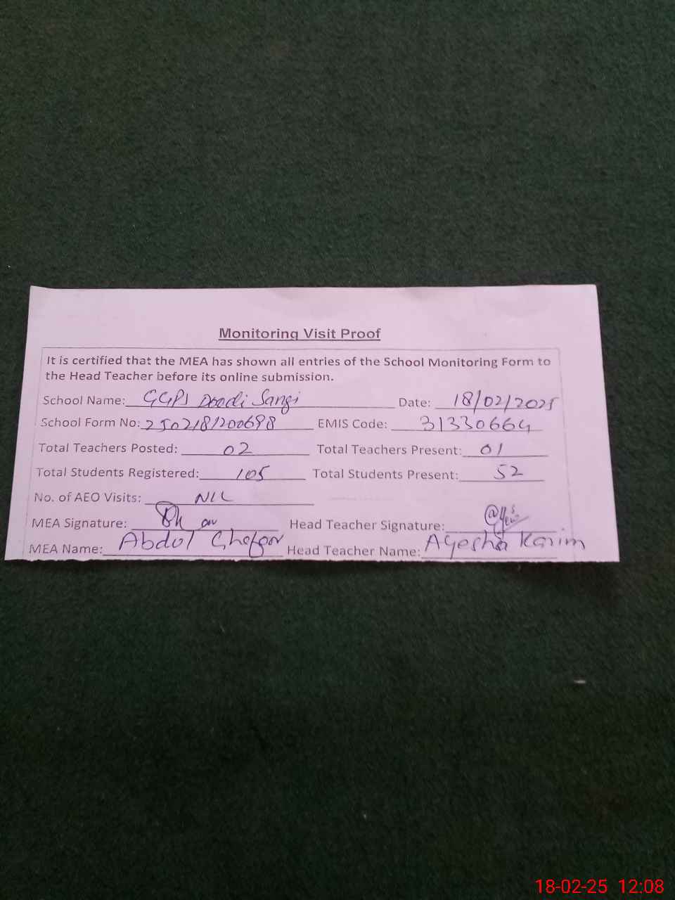 | EMIS Code: 31330664 | Name of School: GGPS DODDI SANGHI BASTI MASTER KHUDA BUX MAHER | |||