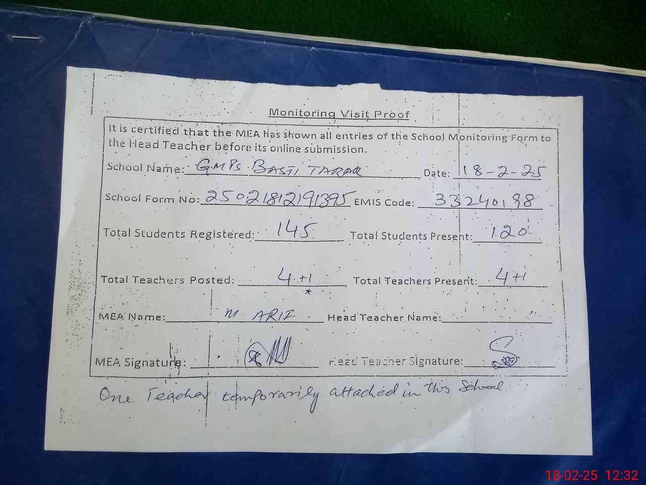 | EMIS Code: 33240198 | Name of School: GMPS BASTI TARAR | |||